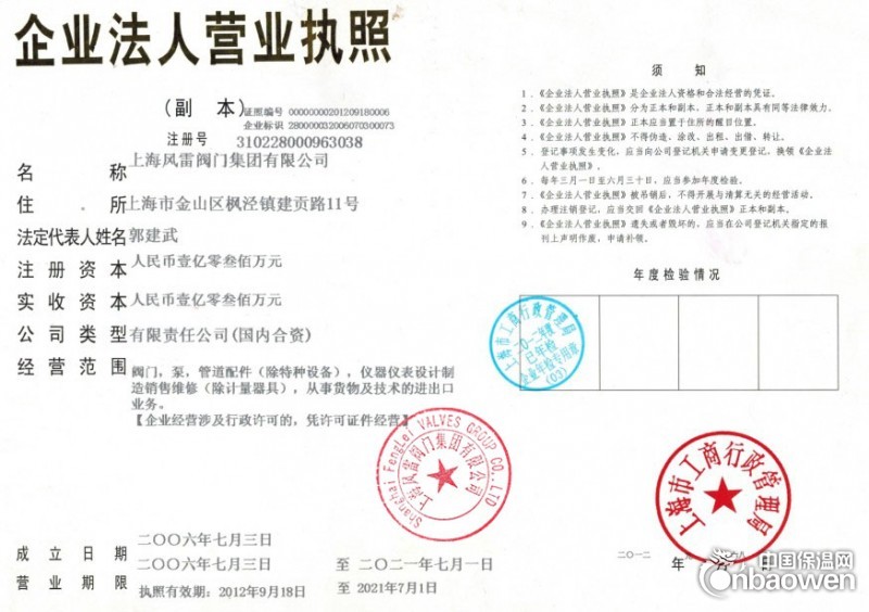 证书介绍 上海风雷阀门集团有限公司 企业法人营业执照